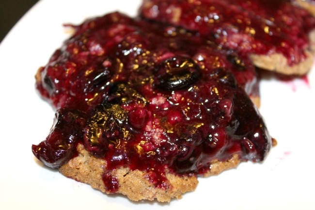 To create the topping I warmed up 100g of frozen blueberries in the microwave and then mashed them. I spooned the warm gooey mixture over the cookies.